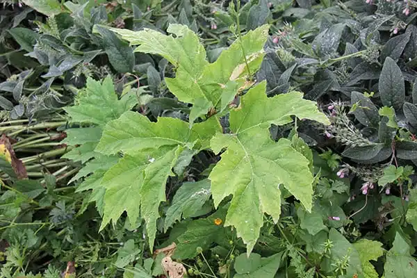 Identification: Large, jagged green leaves (up to 1.5 metres wide) with thick, purple-blotched stems with stiff white hairs. Umbrella-shaped white flower clusters (up to 1 metre wide).